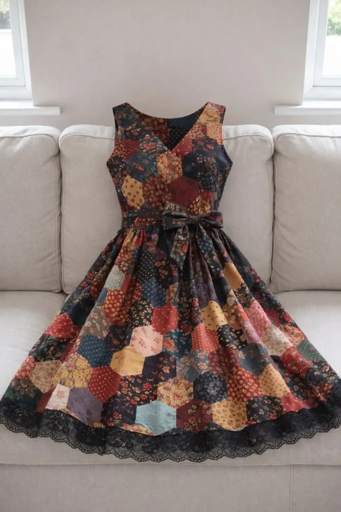 • Bodice in hexagonal patchwork (or other mosaic of hexagonal shapes).