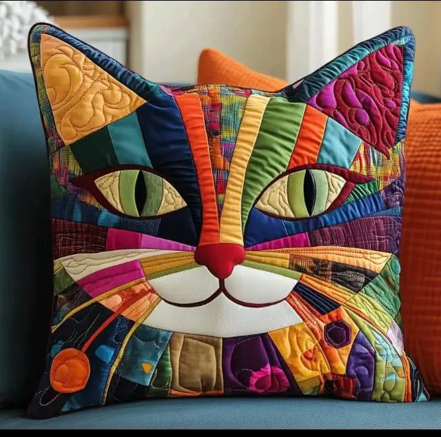 Patchwork is a charming technique that combines creativity and the reuse of fabrics. In this tutorial, you will learn how to make an artistic cushion with a cat’s face, using geometric cutouts, appliqué, and decorative quilting.